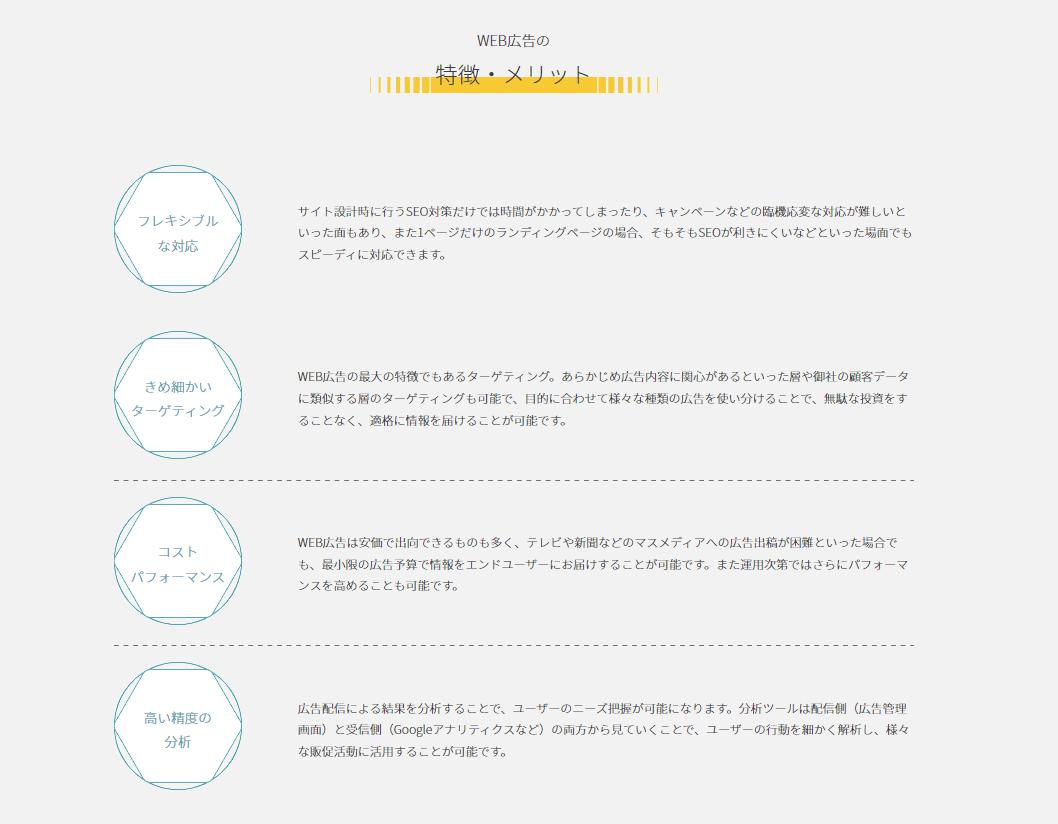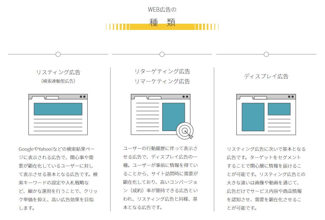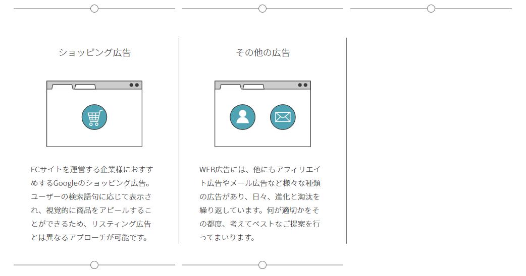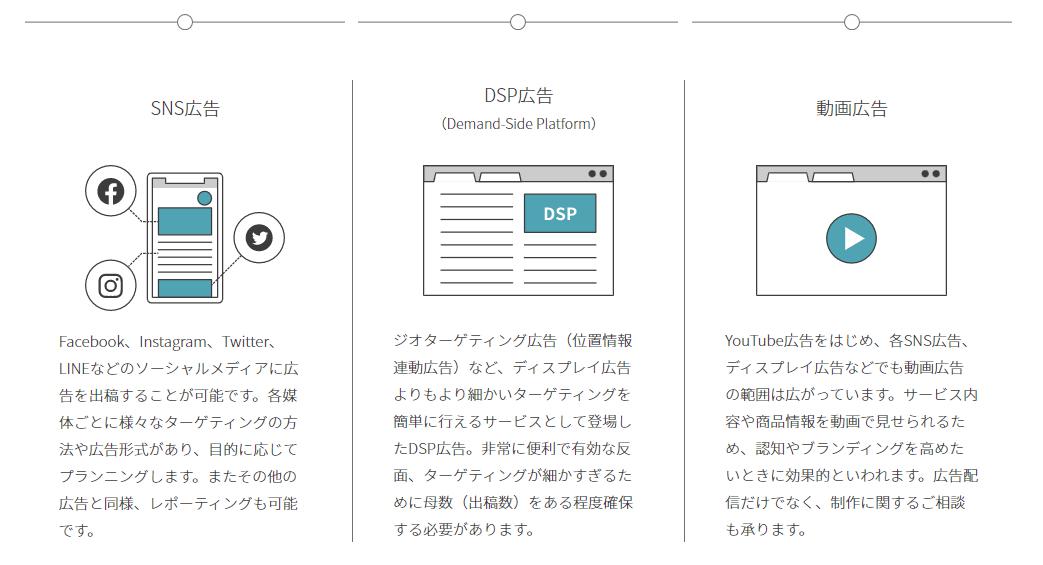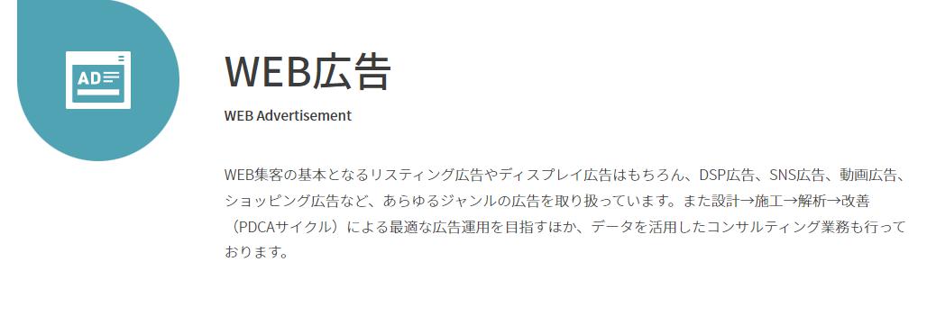 当社のWeb広告は設計、戦略策定にはじまり、基本となる制作・構築・開発、そして運用に至るまで多岐に渡ります。 より良いWebを追求することをモットーに多面的・多角的なアプローチで課題解決や成果を出すことにコミットし、 お客様のより良いビジネスに貢献することを目的としています。